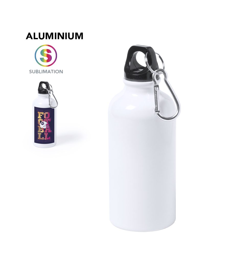 Bidón de 400ml de capacidad con cuerpo de acabado en suave y brillante color blanco, especialmente diseñado para marcaje en sublimación. Con tapón de seguridad a rosca y mosquetón metálico de transporte. Presentado en caja individual.