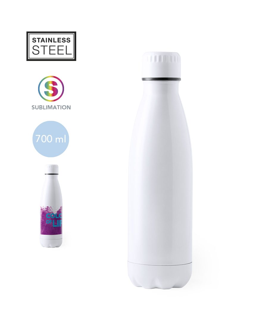 Botella de acero inoxidable para sublimación de 700ml de capacidad en color blanco brillo. Con tapón de seguridad. Presentado en atractiva caja de diseño. Especialmente diseñado para marcaje en sublimación con la imagen que quieras.