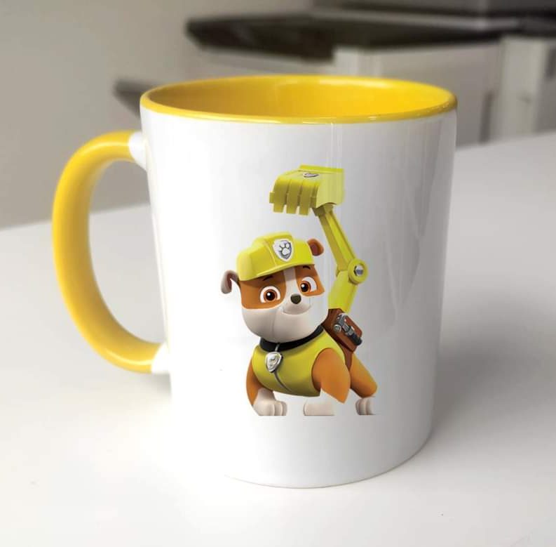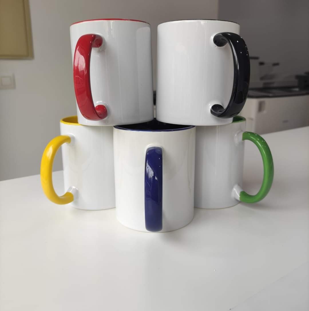 Taza de cerámica de 350ml. Diseño exterior en color blanco especialmente diseñado para la sublimación, pudiendo transferir todo tipo de diseños a todo color, y con una original asa e interior de vivos colores.